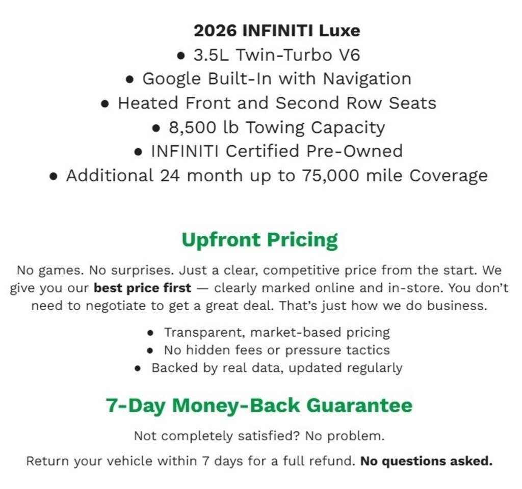 Bergstrom Premier Motorcars of the Fox Valley wants to buy your vehicle - even if you don't buy ours. Get your free and quick offer to purchase. To get our top dollar offer, call our Bergstrom Buying Team Hotline at 920-429-6222. Exterior Package (Silver Rear Bumper Protector and Silver Roof Rail Crossbars), Cargo Package (Carpeted Cargo Area Protector, Console Net, Soft-Sided Cargo Cooler, Cargo Blocks/Stabilizers, and Cargo Net), Silver Interior Lighting Package (Panoramic Illuminated Headliner and INFINITI Radiant Silver Cargo Scuff Plates), Sport Package (SPORT S Badge on Liftgate, Sport Grille and Front Bumper, Dark Chrome Exterior Trim, Graphite Suede Headliner and Pillar Trim, Black Roof Rails and Mirror Caps, Leather Appointed Seating Surfaces, and Wheels: 22 Sport), Split Bench Seat Package, Power Liftgate, Splash Guards, Super Premium Paint, Premium Paint, Spoiler, Turn signal indicator mirrors, Auto-dimming door mirrors, Bumpers: body-color, Power door mirrors, Heated door mirrors, USB Charging Cable Set, INFINITI Radiant Illuminated Silver Kick Plates, Heated and Climate Controlled Front Bucket Seats, Tilt steering wheel, Rear reading lights, Garage door transmitter: myQ Connected Garage, Front reading lights, Driver door bin, Illuminated entry, Overhead console, Leather steering wheel, Outside temperature display, Heated steering wheel, Rear seat center armrest, Tachometer, Driver vanity mirror, Auto tilt-away steering wheel, Trip computer, Apple CarPlay/Android Auto, Telescoping steering wheel, Passenger vanity mirror, Auto-dimming Rear-View mirror, Compass, Rear air conditioning, Rear window defroster, Front dual zone A/C, Air Conditioning, Automatic temperature control, HVAC memory, Power windows, Steering wheel mounted audio controls, Memory seat, Heads-Up Display, Remote keyless entry, Power driver seat, Steering wheel memory, Power steering, Radio: Klipsch Premium Audio System, AM/FM radio: SiriusXM with 360L, 14 Speakers, Audio memory, Radio data system, ABS brakes, Anti-whiplash front head restraints, Dual front impact airbags, Overhead airbag, 4-Wheel Disc Brakes, Low tire pressure warning, Occupant sensing airbag, Front anti-roll bar, Rear anti-roll bar, Knee airbag, Dual front side impact airbags, Emergency communication system: INFINITI InTouch, Four wheel independent suspension, Speed-sensing steering, Adaptive suspension, Traction control, Auto-leveling suspension, Passenger door bin, Security system, Panic alarm, Leather Seating Surfaces, Front Center Armrest, Front Bucket Seats, Ventilated front seats, Heated front seats, Heated rear seats, Power passenger seat, Reclining 3rd row seat, Ventilated rear seats, 3rd row seats: bench, Split folding rear seat, Wheels: 22 x 8.5J Cast Aluminum Alloy, Alloy wheels, ProPILOT Assist 2.1, Active Cruise Control, Speed control, Power moonroof, Rear window wiper, Rain sensing wipers, Variably intermittent wipers, Brake assist, Electronic Stability Control, Fully automatic headlights, Delay-off headlights, Auto High-beam Headlights, Navigation System, and Navigation system: Google Built-in.