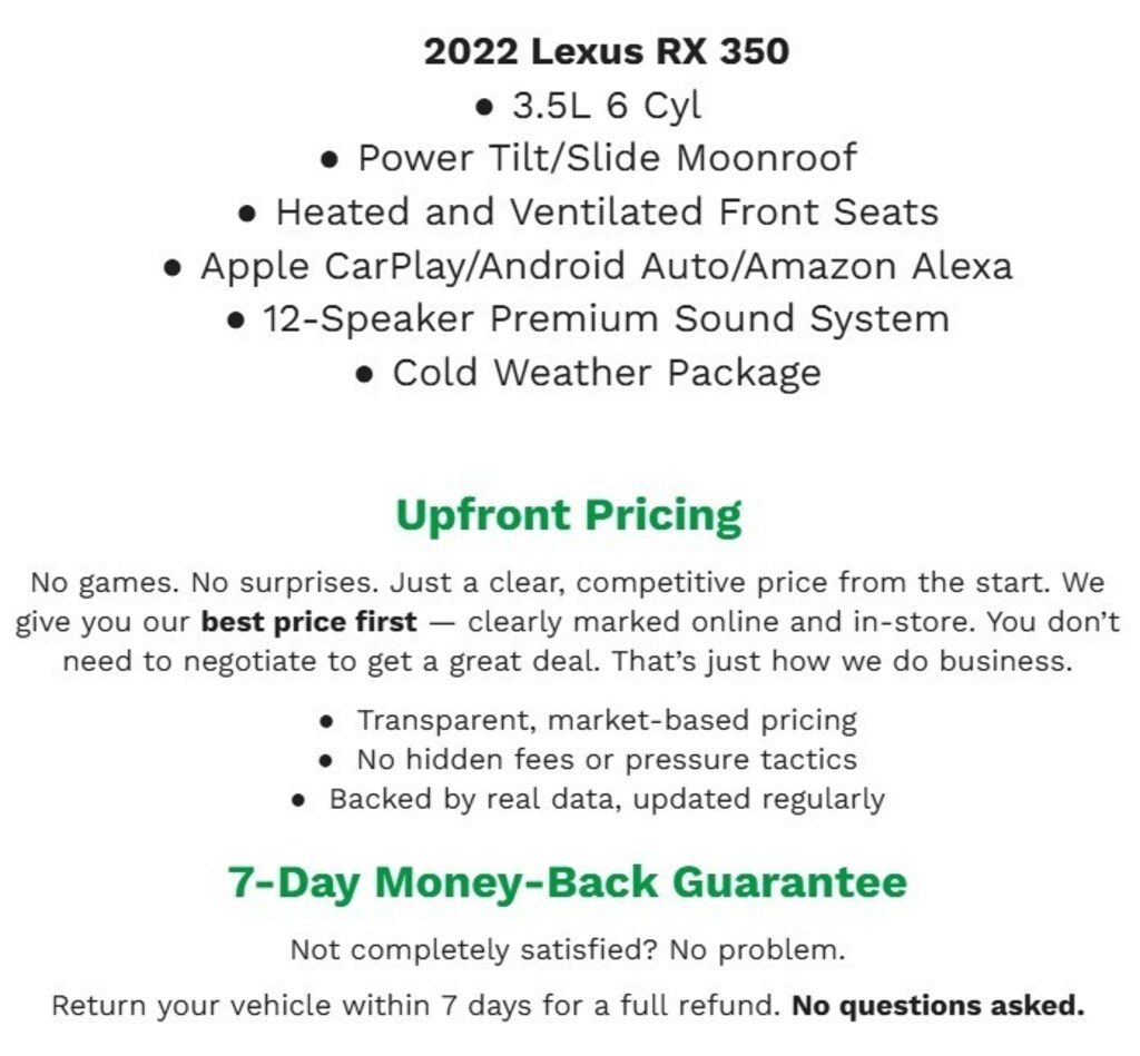 Bergstrom Premier Motorcars of the Fox Valley wants to buy your vehicle - even if you don't buy ours. Get your free and quick offer to purchase. To get our top dollar offer, call our Bergstrom Buying Team Hotline at 920-429-6222. Accessory Package (A2) (Mudguards, All-Weather Floor Liners w/Cargo Tray, and Roof Rack Cross Bars), Cold Area Package, Cold Area Package (CT), Luxury Package (Semi-Aniline Seat Trim and Wheels: 20 Super Chrome Machined Finish), Accessory Package (P1) (Door Edge Guard), Protection Package (Body Side Moldings and Door Edge Film by 3M), Accessory Package (P3) (Paint Protection Film by 3M - Hood & Fender), Premium Package, Special Edition, 3500 lbs Tow Prep Package (Heavy-Duty Radiator and Transmission & Oil Cooler), Accessory Package (Carpet Cargo Mat, Cargo Net, Key Gloves, and Black Wheel Locks), Power Liftgate, LED Fog Lamps, Premium Triple-Beam LED Headlamps, Premium Headlamps w/Adaptive Front Lighting System, Premium Paint (PJ), Running Boards, Spoiler, Turn signal indicator mirrors, Auto-dimming door mirrors, Bumpers: body-color, Power door mirrors, Heated door mirrors, All-Weather Floor Mats w/Cargo Tray, All-Weather Floor Mats, All-Weather Floor Liner, All-Weather Cargo Tray, Wireless Charger, Illuminated Door Sills, Color Heads-Up Display, 12.3 Navigation System, Intuitive Parking Assist w/Panoramic View Monitor, Intuitive Parking Assist & Rr Cross Traffic Alert, Lexus Universal Tablet Holder, Lexus Universal Tablet Holder - Qty 2, Heated Leather Steering Wheel, Telescoping steering wheel, Illuminated entry, Tachometer, Outside temperature display, Rear seat center armrest, Genuine wood console insert, Driver vanity mirror, Driver door bin, Compass, Passenger vanity mirror, Tilt steering wheel, Leather Shift Knob, Overhead console, Genuine wood door panel insert, Trip computer, Garage door transmitter: HomeLink, Front reading lights, Auto-dimming Rear-View mirror, Rear reading lights, Apple CarPlay/Android Auto, Auto Recirculation Air Conditioner, Front dual zone A/C, Air Conditioning, Rear window defroster, Automatic temperature control, Touch-Free Power Rear Door w/Kick Sensor, Steering wheel mounted audio controls, Power windows, Power steering, Remote keyless entry, Power driver seat, 12.3 Navigation System w/Mark Levinson Audio, AM/FM/CD Radio, Radio data system, AM/FM radio: SiriusXM, CD player, 9 Speakers, Low tire pressure warning, Occupant sensing airbag, Front anti-roll bar, Rear side impact airbag, Knee airbag, 4-Wheel Disc Brakes, Rear anti-roll bar, Dual front impact airbags, Anti-whiplash front head restraints, ABS brakes, Overhead airbag, Dual front side impact airbags, Emergency communication system, Wood & Leather Heated Steering Wheel, Four wheel independent suspension, Speed-sensing steering, Traction control, Passenger door bin, Security system, Panic alarm, Ball Mount, Heated Front Seats w/HR, NuLuxe Seat Trim, Power Folding Heated Rear Seats, Heated & Ventilated Front Seats, Heated Front Seats, Front Bucket Seats, Front Center Armrest, Power passenger seat, Split folding rear seat, Wheels: 20 Dark Silver Alloy w/Machined Finish, 18 x 8 Aluminum Wheels, Alloy Wheel Locks, Alloy wheels, Active Cruise Control, Speed control, Panoramic Moonroof, Tilt & Slide Moonroof, Variably intermittent wipers, Rear window wiper, Rain sensing wipers, Exterior Parking Camera Rear, Electronic Stability Control, Brake assist, Delay-off headlights, Fully automatic headlights, Auto High-beam Headlights, 3.33 Axle Ratio, and Navigation System.