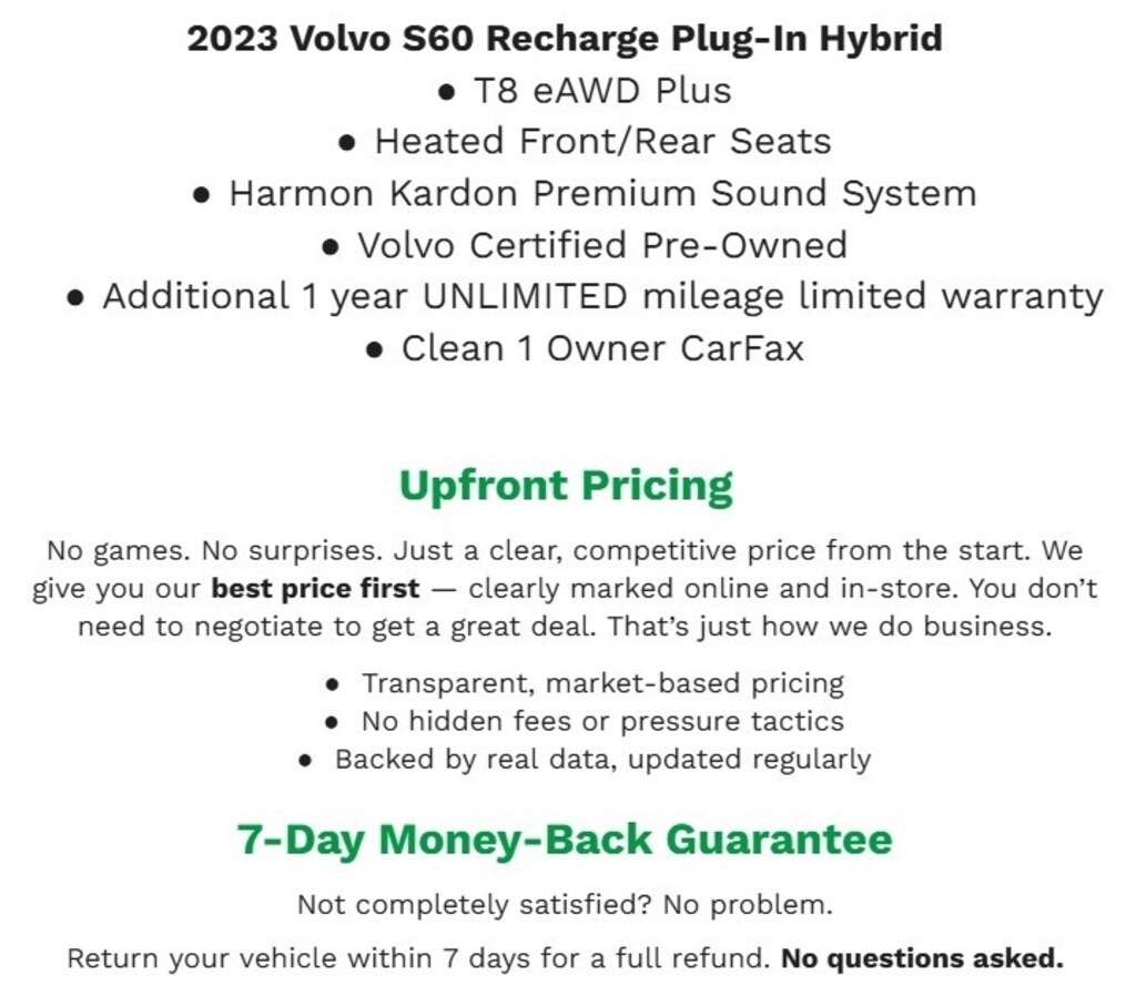 Bergstrom Premier Motorcars of the Fox Valley wants to buy your vehicle - even if you don't buy ours. Get your free and quick offer to purchase. To get our top dollar offer, call our Bergstrom Buying Team Hotline at 920-429-6222. Climate Package (Heated Steering Wheel and Heated Rear Seats), Protection Package Premier (Rubber Floor Mats, Cargo Tray, First Aid Kit, and Wheel Locks), Protection Package, Bumpers: body-color, Heated door mirrors, Turn signal indicator mirrors, Power door mirrors, Auto-dimming door mirrors, Polestar, Overhead console, Leather Shift Knob, Tilt steering wheel, Driver door bin, Garage door transmitter: HomeLink, Trip computer, Rear seat center armrest, Genuine wood dashboard insert, Outside temperature display, Tachometer, Illuminated entry, Telescoping steering wheel, Driver vanity mirror, Rear reading lights, Apple CarPlay/Android Auto, Auto-dimming Rear-View mirror, Passenger vanity mirror, Front reading lights, Air Purifier, Rear window defroster, Air Conditioning, Front dual zone A/C, Automatic temperature control, Remote keyless entry, Memory seat, Power steering, Steering wheel mounted audio controls, Power driver seat, Power windows, harman/kardon Premium Sound, Radio: High Performance Audio, AM/FM radio: SiriusXM, Radio data system, 11 Speakers, Occupant sensing airbag, Low tire pressure warning, ABS brakes, Dual front impact airbags, Emergency communication system: Volvo Cars App w/4 Year Subscription, 4-Wheel Disc Brakes, Overhead airbag, Knee airbag, Dual front side impact airbags, Anti-whiplash front head restraints, Rear anti-roll bar, Front anti-roll bar, Traction control, Four wheel independent suspension, Load Bars, Passenger door bin, Security system, Panic alarm, Leather Seating Surfaces, Heated Front Bucket Seats, Leather Seating Surfaces w/Blond Interior, Front Center Armrest, Front Bucket Seats, Power passenger seat, Heated front seats, Split folding rear seat, Wheels: 19 5-Triple Spoke Black Diamond Cut Alloy, Wheels: 19 6-Spoke Black Diamond Cut Alloy, Wheels: 18 5-Spoke Black Diamond Cut Alloy, Alloy wheels, Active Cruise Control, Speed control, Power moonroof, Variably intermittent wipers, Rain sensing wipers, Exterior Parking Camera Rear, Electronic Stability Control, Brake assist, Delay-off headlights, Rear fog lights, Fully automatic headlights, Auto High-beam Headlights, Navigation System, and Navigation system: Sensus Navigation.